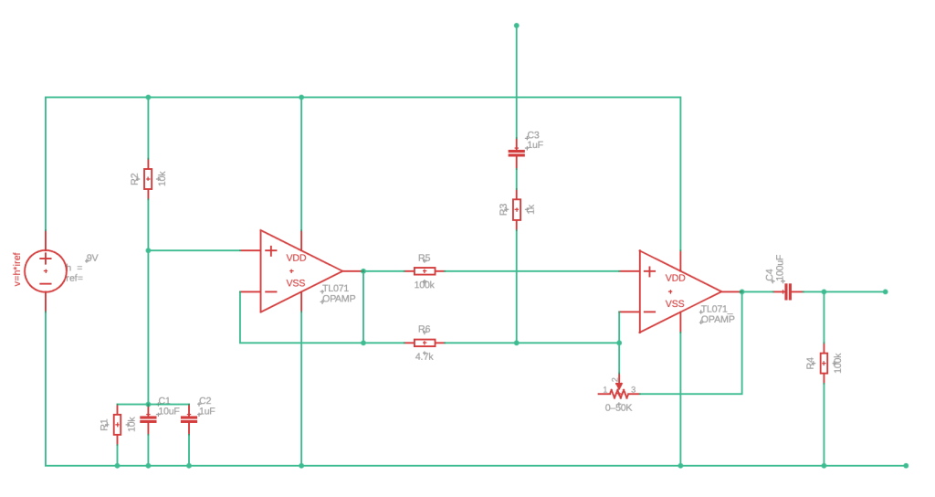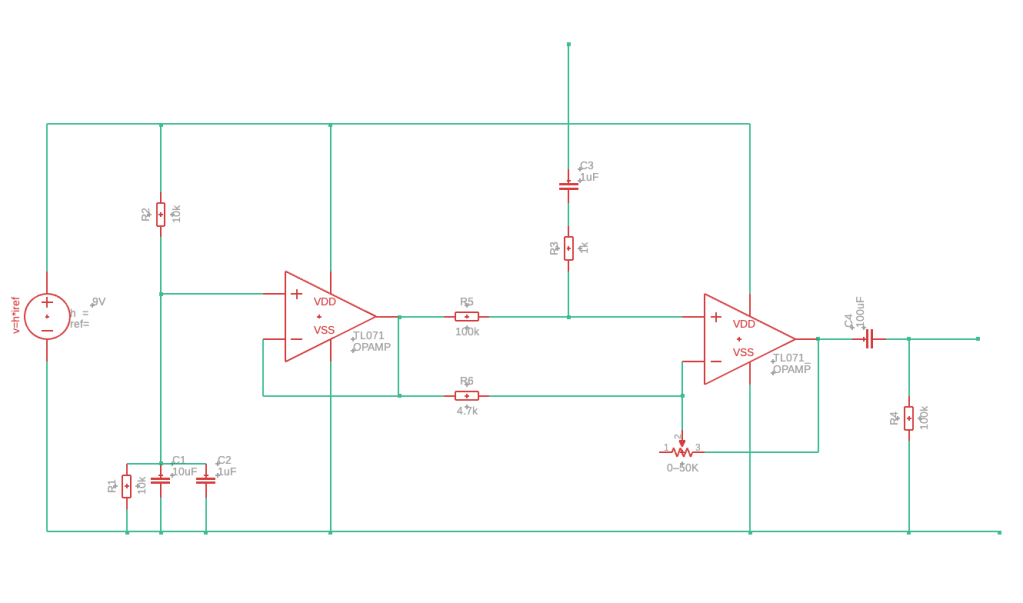 - Virtual ground: Resistive divider (10 kΩ / 10 kΩ) buffered by a TL071 configured as a voltage follower, producing Vref ≈ 4.5 V